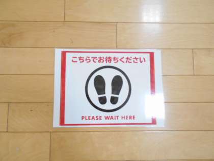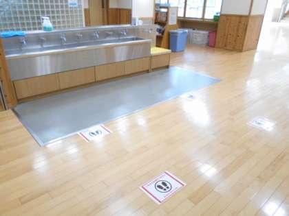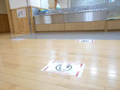 学校では、学校再開に向けて様々な場面における感染症対策を検討し、準備を進めています。今日は、洗面所で密集、密接しないための待機ラインを設けました。