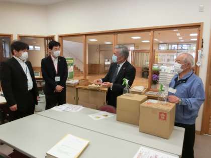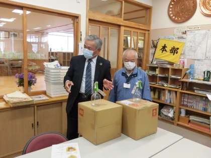 山田自治振興会の会長さんと副会長さんが来校され、コロナウイルス感染拡大を防止するための消毒用除菌水を贈呈していただきました。子供たちにとって安心、安全な学校となるように大切に使わせていただきます。ありがとうございました。