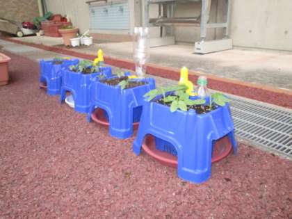 ゴールデンウィーク明けに配布し各家庭でアサガオの種まきをお願いしていました。その鉢を、保護者の皆さんに届けていただきました。子供たちは、ペットボトルのじょうろで水やりをしながら、「大きいな花を咲かせてね」と声をかけていました。