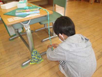 図画工作科「ひもひもねんど」の学習で、粘土を細長く伸ばしていきました。それを使って、「あんもないと」「あろさうるす」「ゆきだるま」「すうぱあまくら」を作りました。思い思いに粘土を伸ばし、楽しく作品を仕上げていきました。