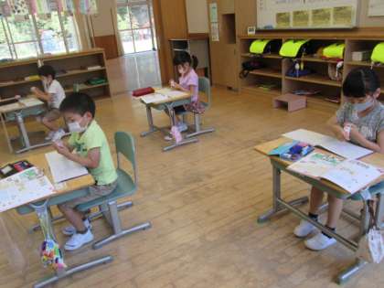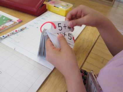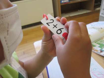算数の学習で、答えが10以内のたし算の計算カードを使って、速く正確に計算できるように練習に取り組んでいます。