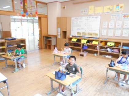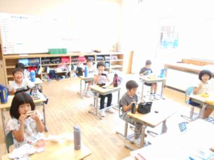 学校再開から今日までは、家庭で準備していただいたお弁当等を食べました。子供たちにとって、とても楽しみな時間でした。