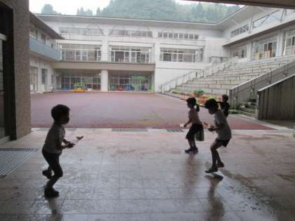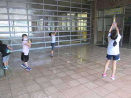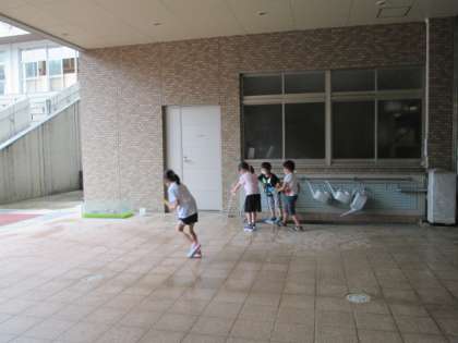 生活科「あつくなったよ」の活動を計画するために、お試しで「ペットボトルで水を飛ばせるか」やってみました。次第にヒートアップし、かなりの距離を飛ばすことがわかりました。雨のように降らせたり、ぐるぐる回って飛ばしたり、アイディアが次々と出てきました。今日は雨でしたが、エントランスで水遊びを楽しみました。