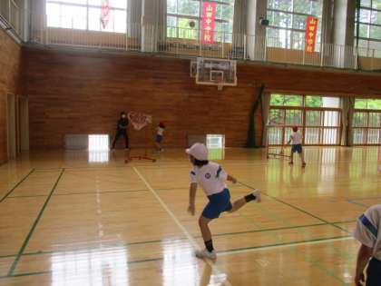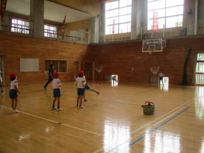次に、ゴールをねらって投げてみました。なかなかゴールに入りません。投げるときの目線や腕の振りに気をつけて投げています。今度はコントロールがよくなることを目指してがんばります。