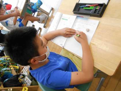 4年生は、わり算の筆算のやり方を学習しています。商を立てる、かける、ひく等の手順を守って計算をしていました。