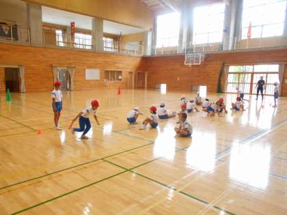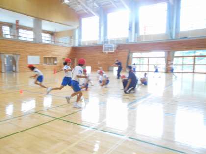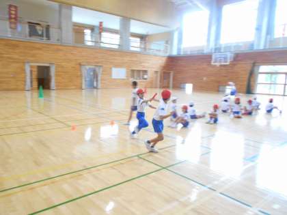 3,4年生は合同体育でリレーの学習に取り組んでいます。リードしながらバトンを素早くつないでいました。