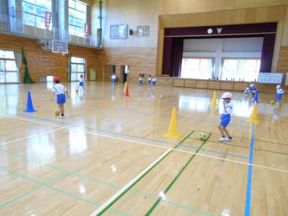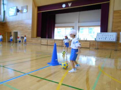 1,2年生は、ボールをうまくさばきながらドリブルの動きにチャレンジしています。ジグザグに進むのがなかなか大変です。