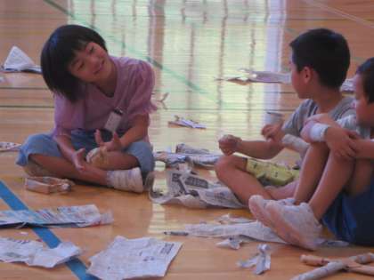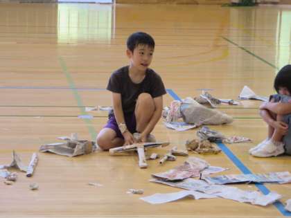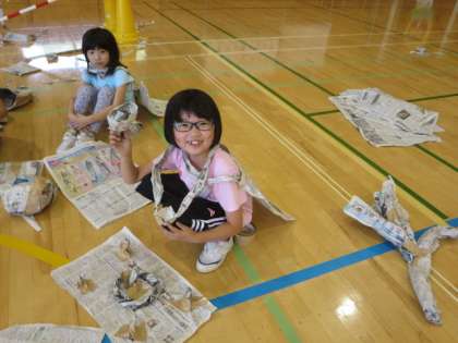 23日の図画工作の授業は「しんぶんしとなかよし」という学習をしました。新聞紙を使って造形遊びを楽しんだ後、自分の作品の工夫した所や友達の作品のよい所を発表し合いました。