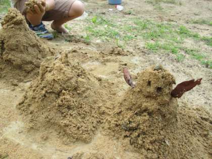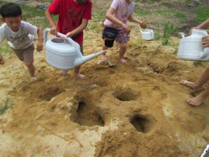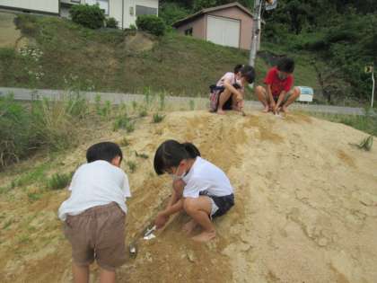 図画工作科の「すなやつちとなかよし」の活動を楽しみました。グラウンドの角の砂山で、山を作ったり穴を掘ったり水を流したりしながら、手や足、体全体の感覚を働かせて、思いついたことを試す活動をしました。あっという間に1時間半が過ぎました。