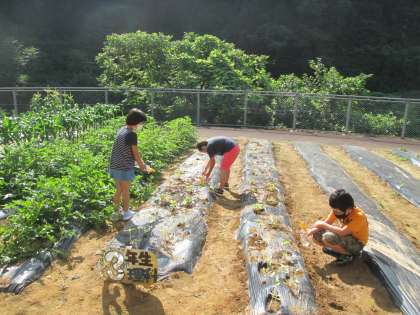 昨日、理科の時間にヒマワリ、ホウセンカ、ピーマン、オクラを畑に植え替えました。今朝、登校すると早速水やりをしていました。植物の様子をじっと観察している子もいました。この後の生長が楽しみな3年生たちです。