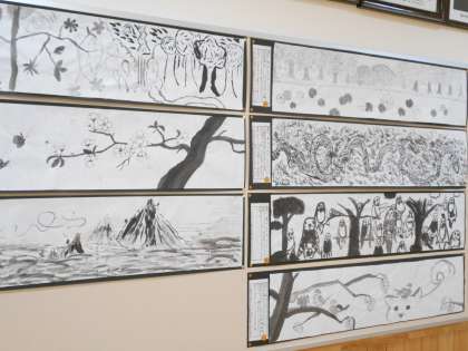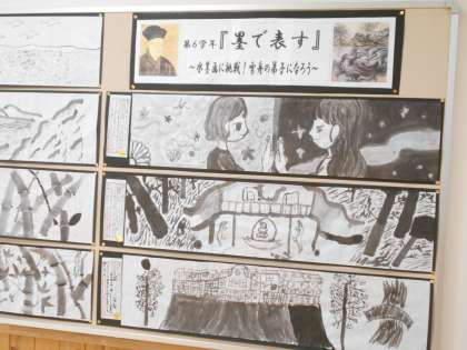 6年生は、墨の濃淡を生かして描く墨絵に挑戦しました。子供たちは、墨の濃淡だけでなく、線の太さや細さを工夫して表現しています。
