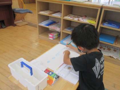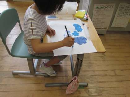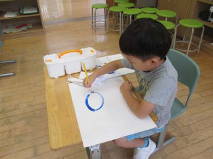 図画工作科の時間に、水彩の使い方の練習をしました。水の量、パレットの使い方、絵の具の出し方、片付け方等、実際に描いて確かめました。