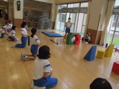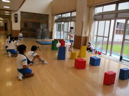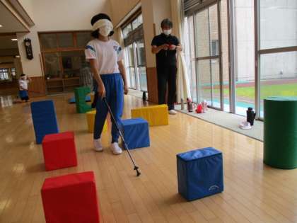 総合的な学習の一環で、目隠しをして視覚障害疑似体験をしました。友達の声を頼りに障害物をよけながら歩いたり、手すりを使いながら階段を昇降したりしました。「まっすぐ歩くのが難しい」「こわかった」などと感想を述べていました。