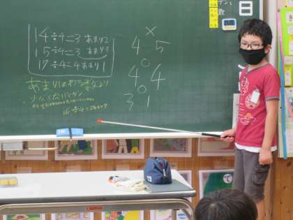 算数の学習では、あまりのあるわり算に取り組んでいます。わる数とあまりの関係を見つけて友達に分かりやすく発表していました。