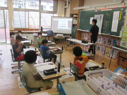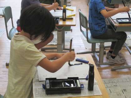 書写の時間では、力の入れ方を変えていろいろな太さの横画を書いたり、筆使いに気をつけて左はらいを書いたりすることに取り組みました。