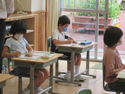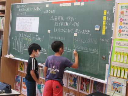 算数の学習では、あまりのあるわり算に取り組んでいます。今日は、文章問題に取り組み、自分の考えを図や式で黒板に表して発表していました。