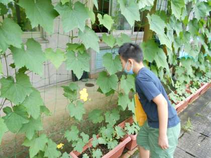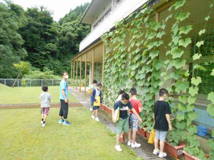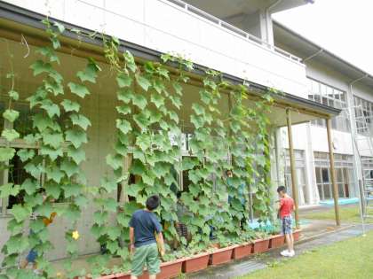 校庭のプランターで育てているヘチマが、気温の上昇に伴ってどんどん成長しています。今日は、雄花や雌花の付き方を中心に観察しました。
