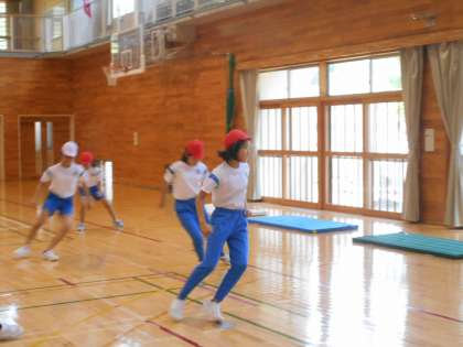 5,6年生の合同体育で、反復横跳びの運動能力テストを行いました。俊敏な動きで自己記録更新を目指しました。
