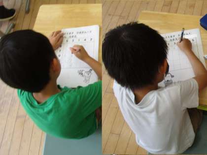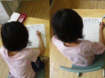 足し算引き算の25ます計算を繰り返し練習しています。集中して取り組んでいました。