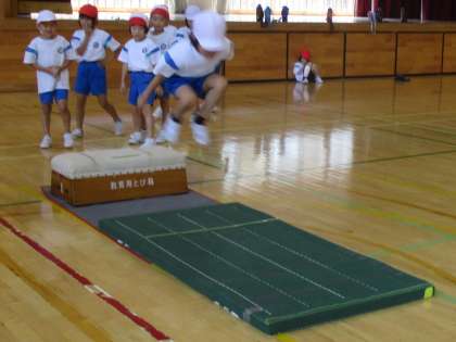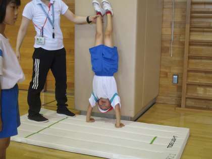 体育の時間では、跳び箱から飛び降りたり、壁を使いながら自分の体を手で支えたりいろいろな動きに挑戦しました。