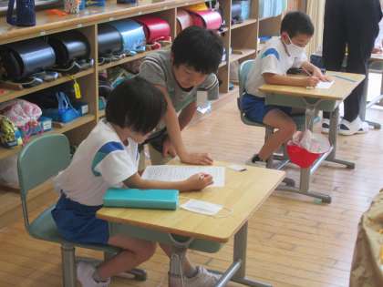 算数では、「水のかさ」の学習が仕上げに入ってきました。プリントで練習問題に取り組みました。早く終わった子は「ミニ先生」として友達に分かりやすくアドバイスしていました。