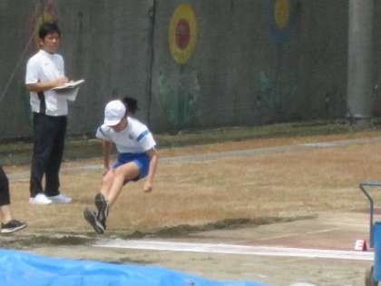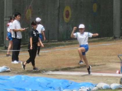 体育の時間に走り幅跳びを行いました。振り上げ足を高く引き上げ、腕を大きく振って遠くまで跳んでいました。