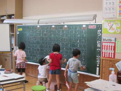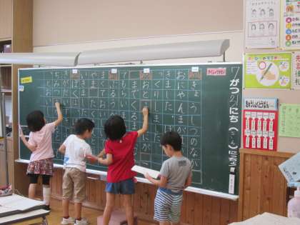 国語の学習で、いろいろな文を書く練習をしました。「は、を、へ」や小さく書く「っ、ゃ、ゅ、ょ」等に気をつけながらノートにも黒板にも書いていました。