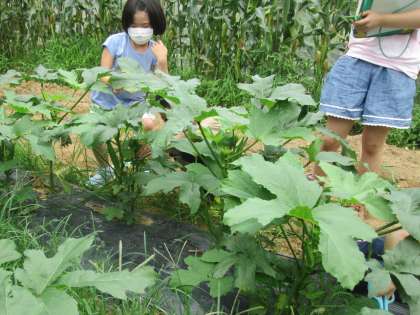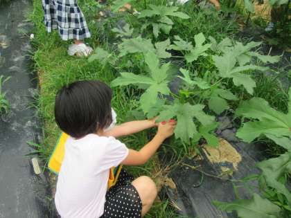 理科の学習で植えていたオクラが次々と実ってきました。中には15cmを超えるくらい生長したオクラの実もありました。しっかり観察した後、収穫しました。