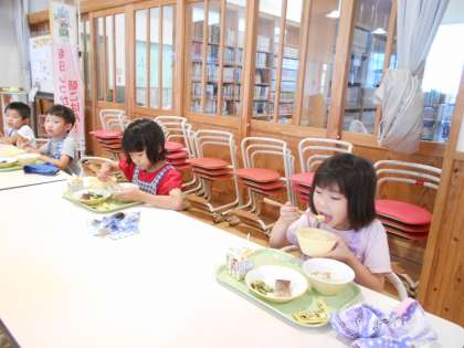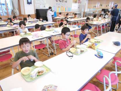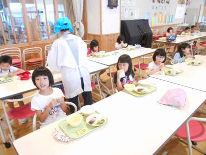 給食を配膳する直前まで、給食室で運搬車を管理して食品衛生に十分注意しています。