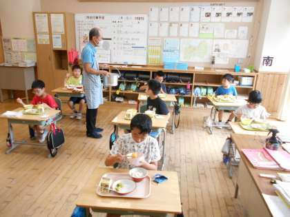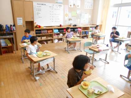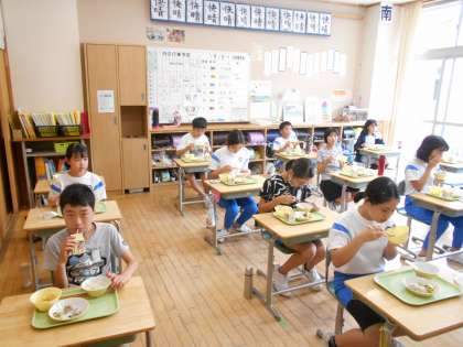 4〜6年生は、それぞれの教室で給食を食べています。夏バテしないようにしっかり食べましょう。