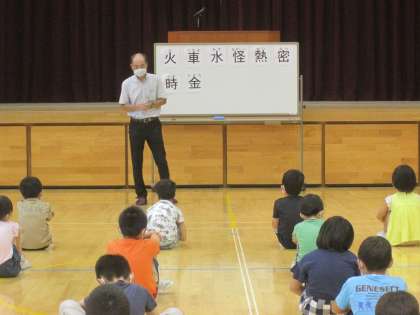 その後、夏休みの過ごし方についてキーワードの漢字を示しながら「心のブレーキ」をしっかりかけられる山田っ子でいようと全校で確認しました。