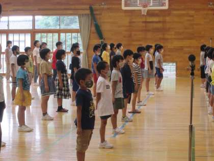 始業式では、校長先生が、夏休みに登山をした体験を日々の学習にたとえて話しました。辛くてもあきらめないで、一歩一歩歩くことは、日々の学習をこつこつと続けることと似ていること、また、登山の途中に靴底が外れるという困難(勉強が分からない)があったけれども、持っていた包帯やひもで靴を直して(工夫して乗り越え)、頂上(目標)に向けてこつこつ努力することができたことを話しました。