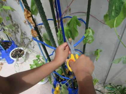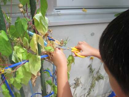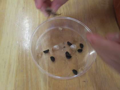 今日から、アサガオの種取りを始めました。今日までに咲いた花の数は、4人の合計が800個になりました。「茶色くなったものから取る」と、試しに1個ずつ取りました。