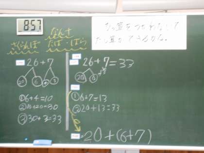2年生は、繰り上がりのあるたし算のやり方を考えました。計算がより分かりやすくなるように、数の分解や合成をして計算しました。