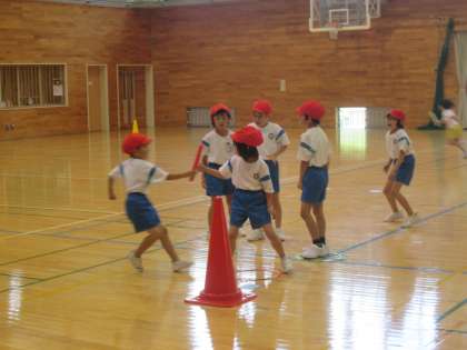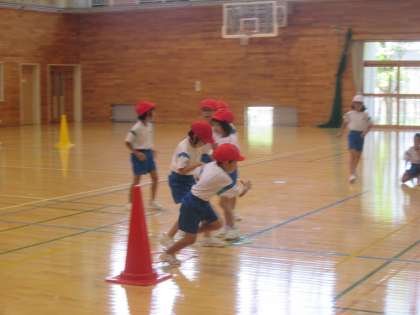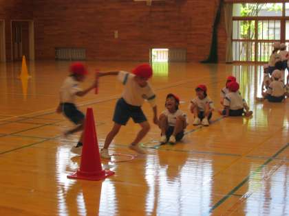 運動会に向けてリレーの練習に取り組んでいます。バトンを受け取ったら力いっぱい走り、次の人にバトンを渡していました。