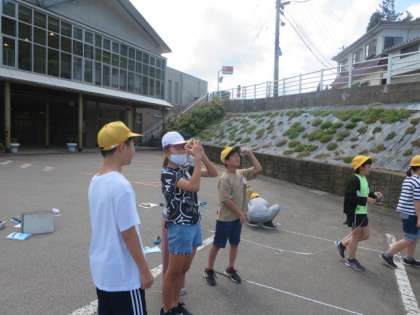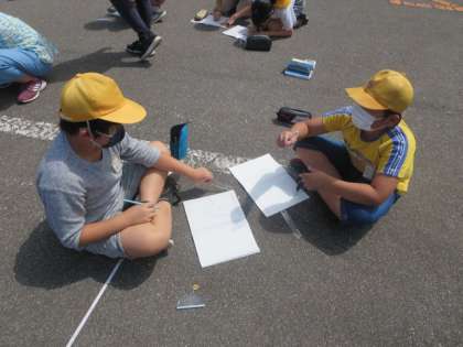 6年の算数科は拡大図と縮図の学習を行っています。本日は学習のまとめとして、2人ペアとなり縮図を利用して国旗掲揚塔の高さを求めました。くらしに生かすことができる算数のよさを実感していました。
