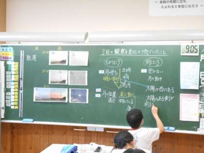 6年生は、月と太陽の位置が変わることで、月の満ち欠けが変わることについて学習をしています。観察した記録をもとに考えました。