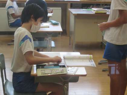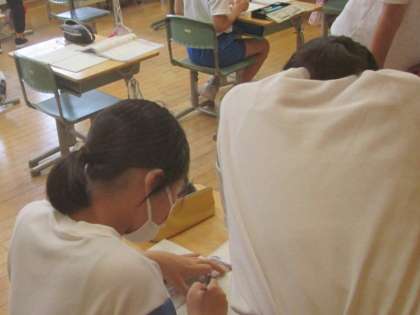 算数の学習では、拡大図と縮図の学習が仕上げになりました。各自、練習問題に取り組みました。早くできた児童は、悩んでいる友達にアドバイスをし、互いに理解を深めました。