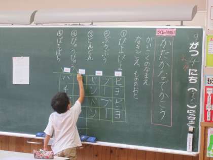国語の学習で、カタカナの練習をがんばっています。本日は、小さく書くカタカナや伸ばす音のある言葉を書きました。各自で練習した後、一人ずつ黒板に大きく丁寧に書きました。