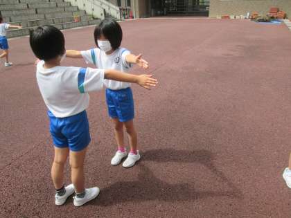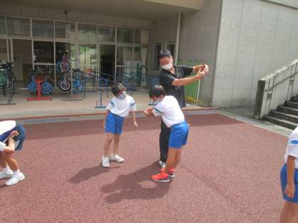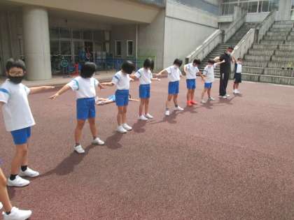 理科で「太陽とかげを調べよう」という学習をしています。運動広場に出てかげつなぎをしてみました。互いの手や体をふれないで影をつなげることができるのか試してみました。