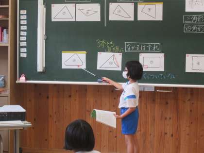 三角形と四角形の仲間分けをしました。それぞれにあてはまらない図形についても理由をしっかり発表しました。