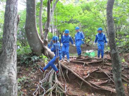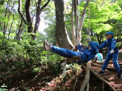 例年は1泊2日の宿泊学習を行っていますが、今年度は1日プランの「野外体験活動」となりました。天候にも恵まれ、山田の大自然を体験できる活動を思い切り満喫することができました。木の枝にロープをかけ、ブランコ作ってを楽しむなど、「富山市子どもの村」ならではの体験ができました。