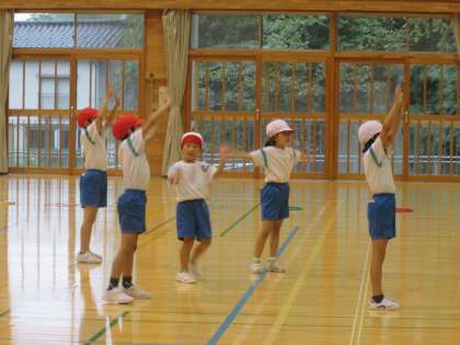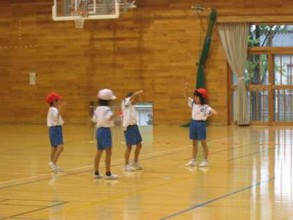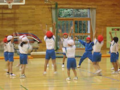 体育の時間に、音楽に合わせて自由に体を動かしてみました。自分なりに手を振ったり、友達と動きを合わせてみたりして楽しみました。