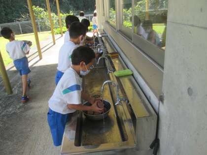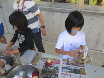 生活科の学習で、先日収穫したさつまいもで焼きいもの準備をしました。さつまいもを丁寧に洗い、新聞紙で包み、水でぬらした後、アルミホイルでくるみました。