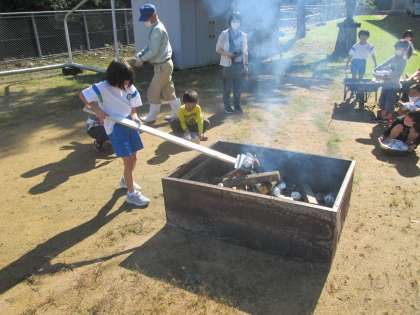 たき火の中にさつまいもを入れるのにも挑戦しました。できあがったら全校のみんなに振る舞います。