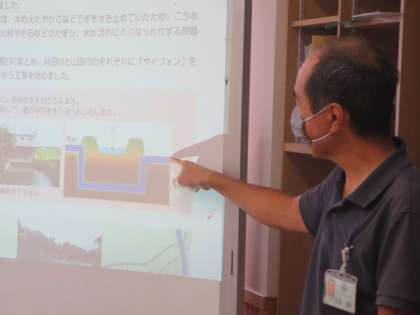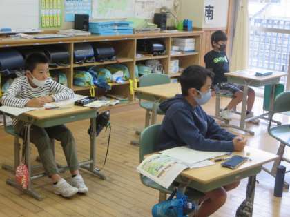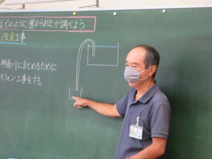 4年生の社会科は、先人の偉業について学習しています。この日は、牛ヶ首用水の工夫について話し合いました。サイフォンの仕組みを生かして、高低差のある土地に用水をつくったことを学びました。