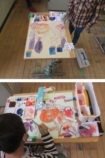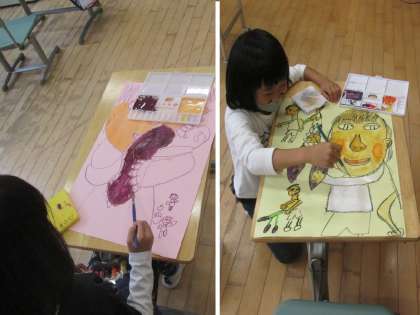 生活科の学習で、行ったさつまいも掘りの時の感動を絵に描いています。絵の具の色や水の量を少しずつ変えながら、丁寧に描きました。