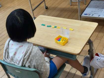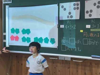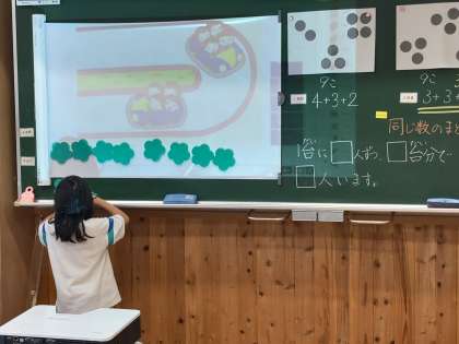 算数の学習で、かけ算の学習が始まりました。今日の授業では、かけ算の考え方の基本になる「1台に○人ずつ、△台分で□人乗っている」のように、乗り物に乗っている人数をおはじきで並べながら考えました。