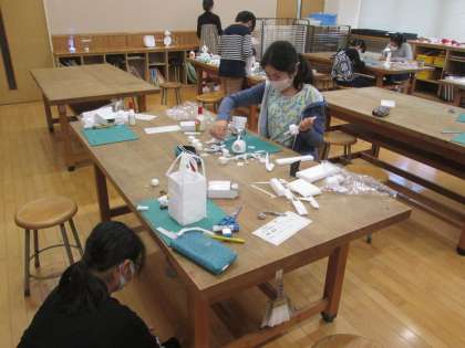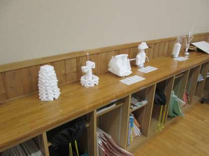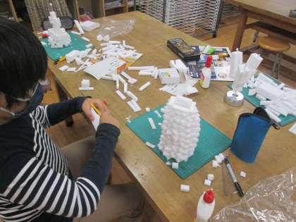 LEDの光をストローに通したり、スポンジを重ねたりしながら、光の効果を生かした立体をつくりあげていました。