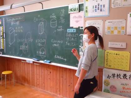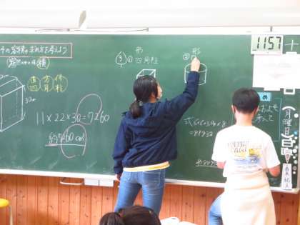 6年生の算数では、およその体積について学習しています。身の回りにある立体を、基本の立体図形に見立てて体積を求めました。ランドセルの中身やホールケーキの大きさを求めることができました。